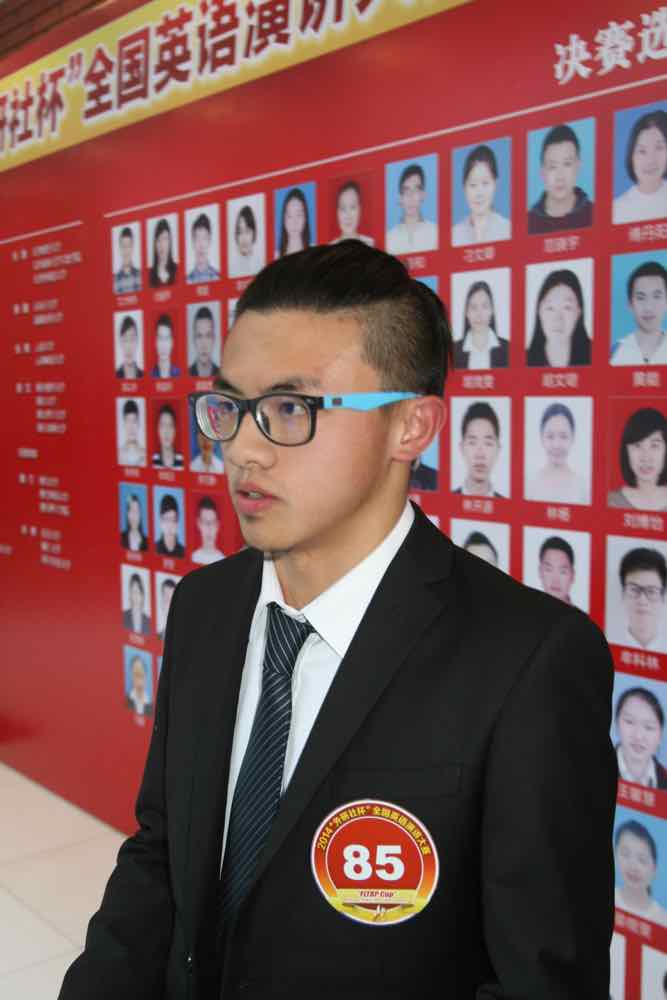 这是85号选手张子贺第二次参加“外研社杯”,去年的他,还没有留起如此不羁的发型。去年的比赛之后,他拿起单反,在香格里拉做起了志愿者。他不仅担任图书管理员和英语老师的职务,还寻访了深山里的麻风病村。看到那些因为疾病无法接受教育的孩子,他感到自己的同情心在增长。看到今年的赛题“Change the Unchangeable”,他毫不犹豫地参赛,只是因为“有东西想表达”。张子贺去年在演讲台上左右踱步的姿态令人印象深刻,他说今年还会这么做:“我就是我,还是坚持做自己。”他的脚步,就这样在光滑的地板上摩擦,摩擦...