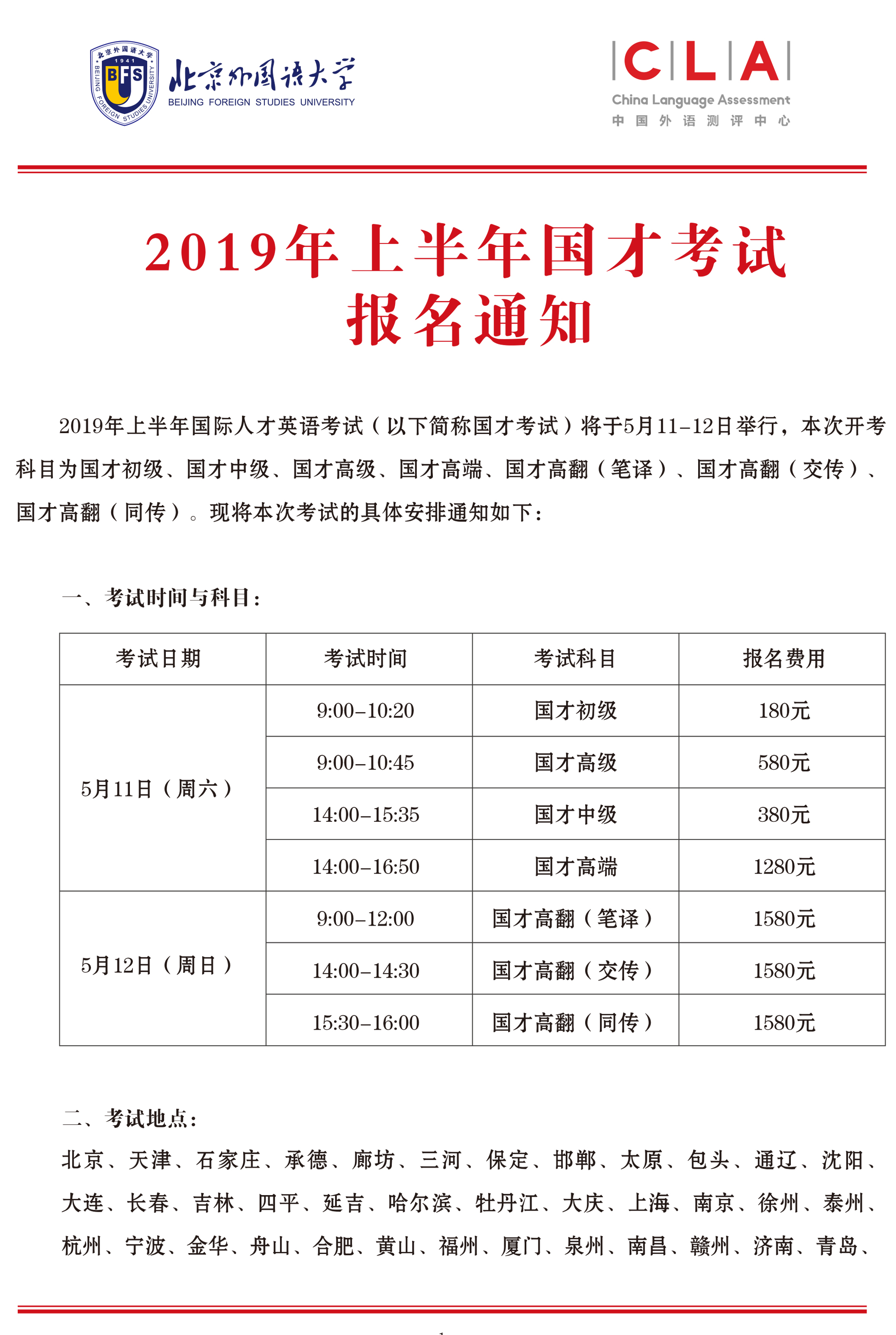 2019年上半年国才考试将于5月11日-12日在全国举行,报名期为2018年12月17日至2019年4月15日,开考科目包括国才初级、国才中级、国才高级、国才高端、国才高翻(笔译)、国才高翻(交传)、国才高翻(同传)。
